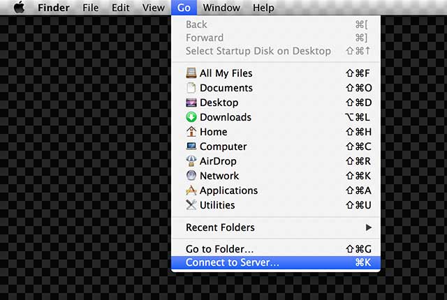 1. Open the Go menu in the Finder top bar and select Connect to Server.