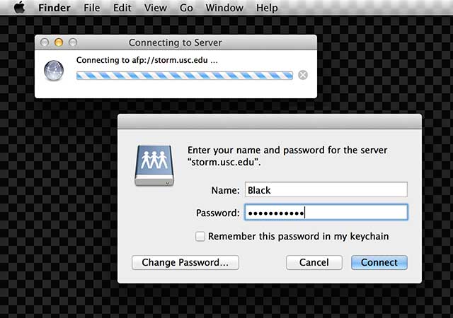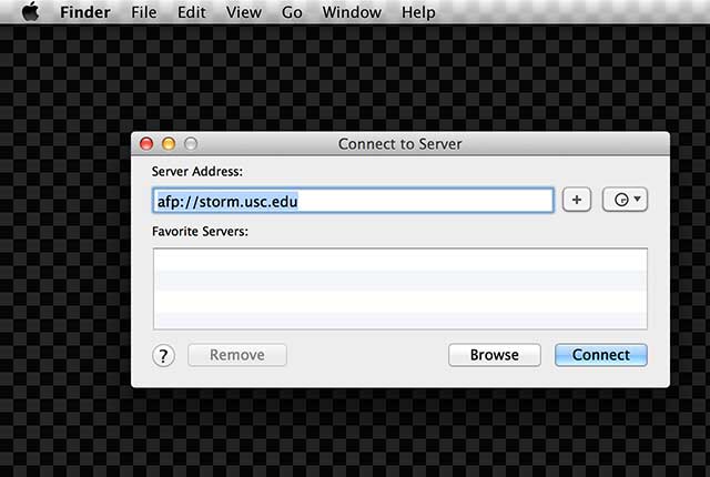 2. A prompt will appear requesting server information. On Server Address you write storm.usc.edu and click Connect.