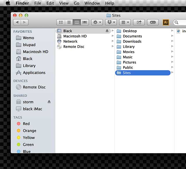 5. Navigate in your Finder to the Sites directory inside your recently mounted Storm drive. The Sites directory is going to be the Root directory for your class website. Everything you put in there will be available online at the following URL: http://storm.usc.edu/~yourusername/. For IML 400, you can ignore all the directories next to Sites.